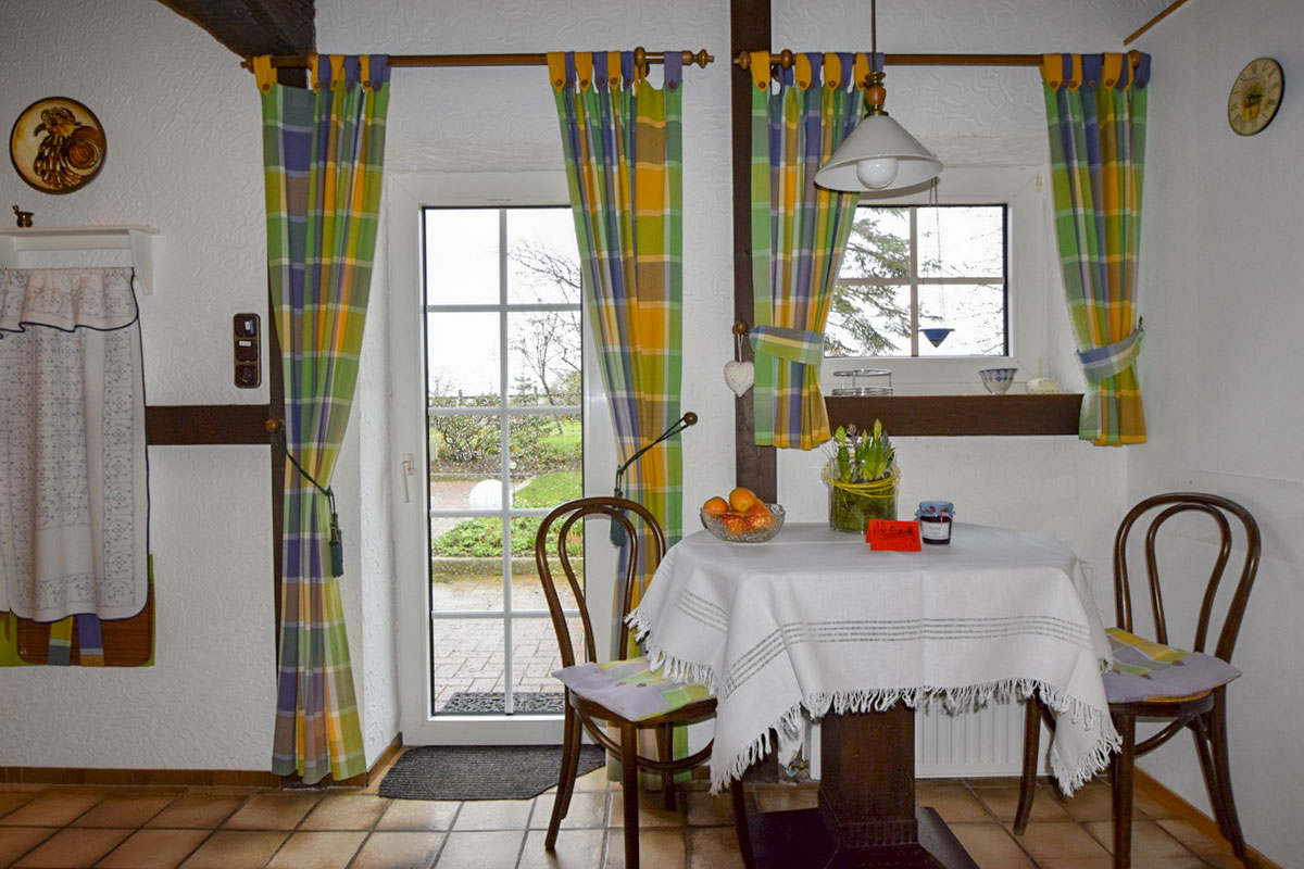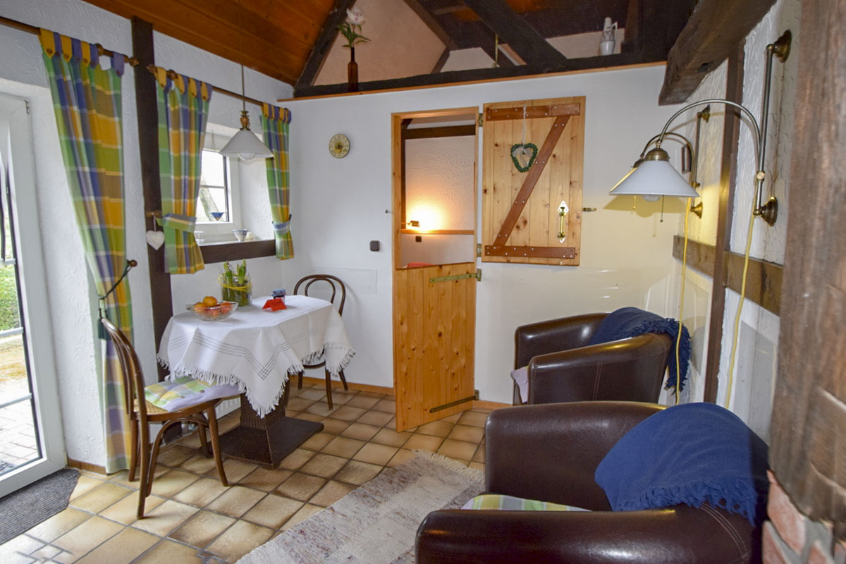 Sie sind auf der Suche nach einem Feriendomizil für Zwei? Dann ist unsere Schrotkammer genau das Richtige für Sie. Fachwerk- und Mauerelemente geben dieser Wohnung das gewisse Etwas und vermitteln Ihnen den Charme des alten Hauses. Drei große Fenster machen die Wohnung zu einem lichtdurchfluteten Ort zum Wohlfühlen. Sie ist ebenerdig und sehr zweckmäßig aufgeteilt. Den gemütlichen Schlafbereich erreichen Sie durch eine Klönschnacktür. Und vom Wohnbereich haben Sie direkten Zugang zur Terrasse. Bei schönem Wetter (und das haben wir hier ja fast immer) ist dieser Außenplatz eine wunderbare Ergänzung: eingerichtet wie ein Zimmer im Freien können Sie hier schlafen, essen und ausruhen.